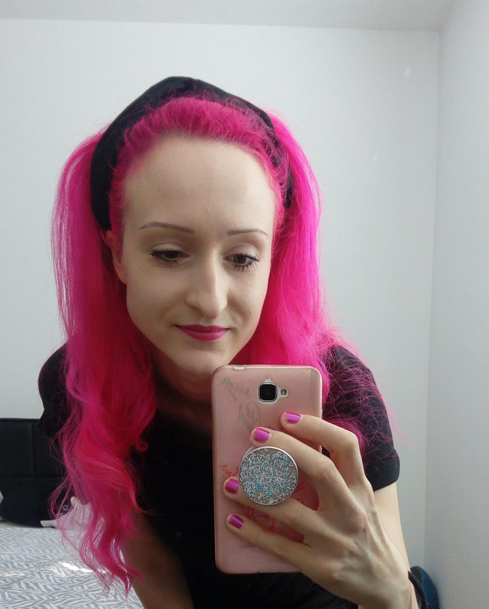 Manic Panic Hot Hot Pink. Normally I use Arctic Fox Virgin Pink but they don´t distribute during corona times. However, this color is very similar, vibrant and long-lasting. Plus, it glows under UV light!