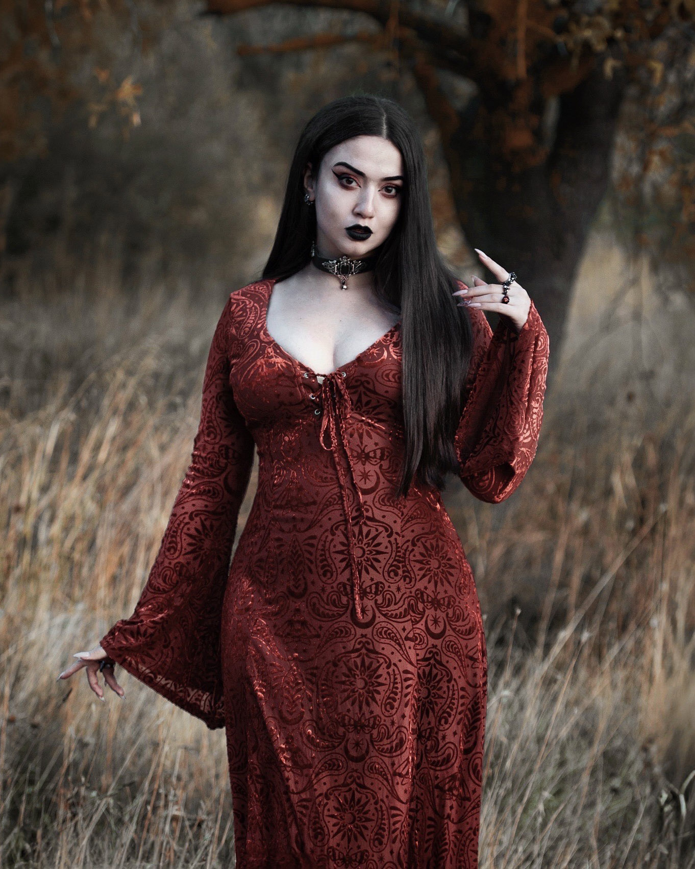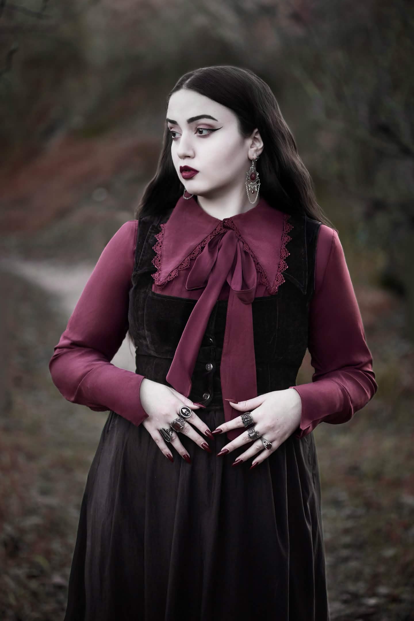 My photography style is romantic, a little melancholic, with heavy emphasis on gothic clothing and aesthetics. My creative process is very detail-oriented. When I shoot and edit, I spend hours perfecting shadows, tones, and textures because I want the final result to look good as well as evoke the theme that I want. I care a lot about atmosphere and storytelling in every image.